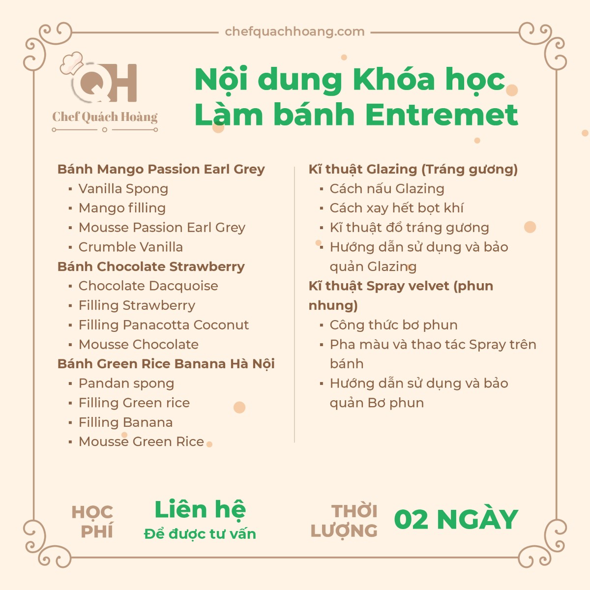 Entremet là biểu tượng của sự tinh tế trong nghệ thuật bánh ngọt, nơi kỹ thuật quyết định tất cả. Việc cân đo nguyên liệu chính xác, đánh bông mousse đạt chuẩn hay giữ nhiệt độ hoàn hảo khi phủ gương là những bước không thể sai sót. Mỗi lớp bánh phải hòa quyện với nhau, không bị tách lớp. Bạn không chỉ cần kỹ thuật mà còn phải có mắt thẩm mỹ để tạo ra một tác phẩm Entremet. Chính sự chuẩn chỉnh trong từng khâu mới làm nên sự hoàn hảo.